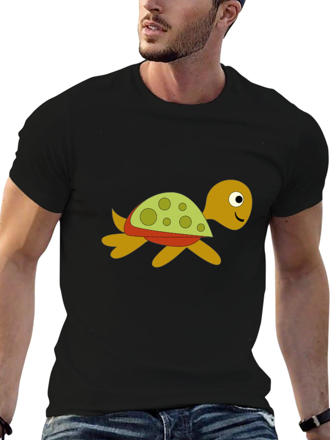 Showcase your playful side with this eye-catching black t-shirt. The shirt features a whimsical cartoon turtle graphic in bright, cheerful colors. The turtle has a light-green shell with dark green spots, an orange under-shell and yellow legs. The simple design is perfect for casual wear. This tee is ideal for adding a pop of color to your everyday wardrobe. Made from comfortable materials, it's great for weekend outings, relaxed days at home, or adding a fun twist to any casual outfit. Grab this comfy tee for a touch of fun!