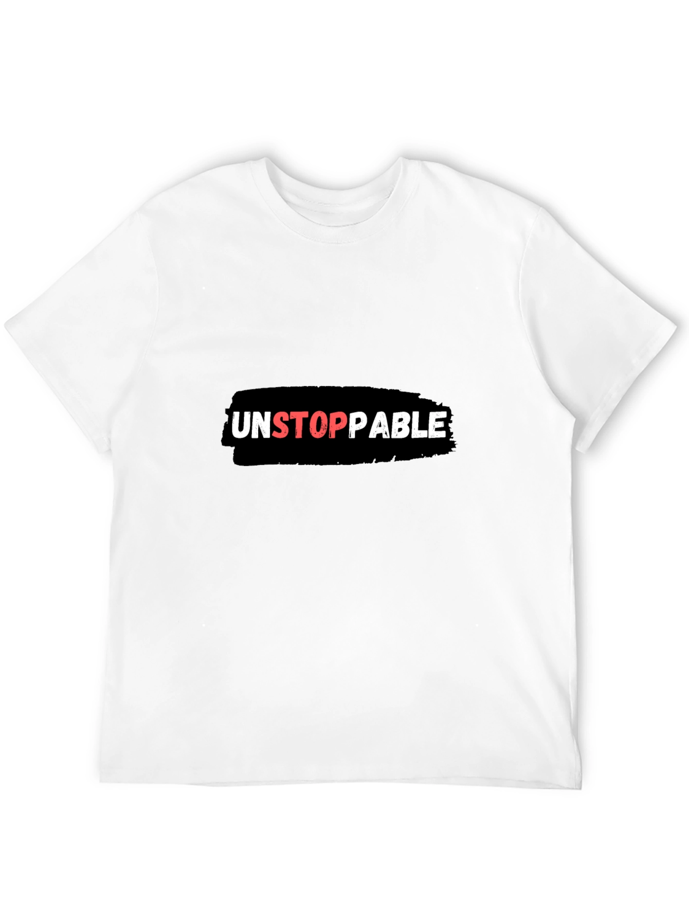 Show your resilience with this bold black tee. Featuring the word "UNSTOPPABLE" in a striking white and red font over a dark background, this t-shirt makes a powerful statement. Crafted from a soft, breathable cotton blend, it offers both comfort and style. The classic crew neck and short sleeves make it ideal for everyday wear. Wear it to the gym, while hanging out with friends, or when you need an extra boost of confidence. This versatile t-shirt will become a favorite in your wardrobe and a reminder that you are, indeed, unstoppable.