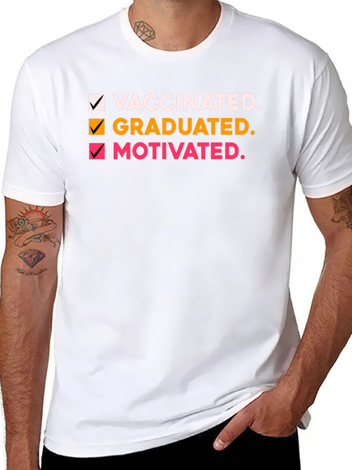 Celebrate success with this bold, black T-shirt! Featuring the playful statement "Vaccinated. Graduated. Motivated." with checkmarks in white, orange, and pink, this tee is perfect for graduates ready to take on the world. Its classic crew neck and comfortable fit make it ideal for everyday wear, graduation parties, or casual outings. Show off your achievements and positive attitude in style with this eye-catching design. A great gift for the accomplished graduate!