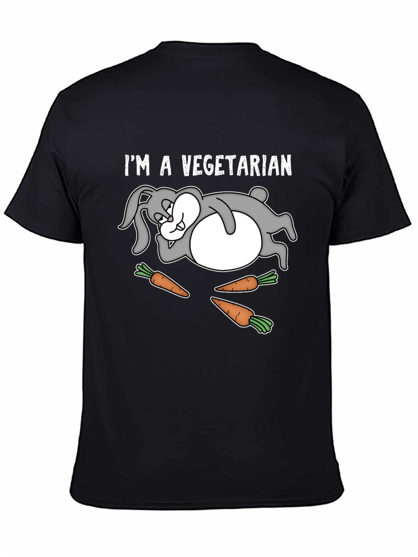 This black t-shirt features a humorous graphic print that's sure to spark conversations. The design showcases a cartoon rabbit lying down amidst scattered carrots, playfully proclaiming "I'M A VEGETARIAN". Crafted from what appears to be a soft and breathable cotton blend, this tee offers both comfort and style. Its classic fit makes it versatile for everyday wear. Ideal for animal lovers, vegetarians, or anyone with a quirky sense of humor, this t-shirt makes a statement without saying a word. Pair it with jeans, shorts, or even a casual skirt for a laid-back look. It's perfect for casual outings, weekend adventures, or just lounging around the house. Show off your personality with this eye-catching and fun t-shirt!