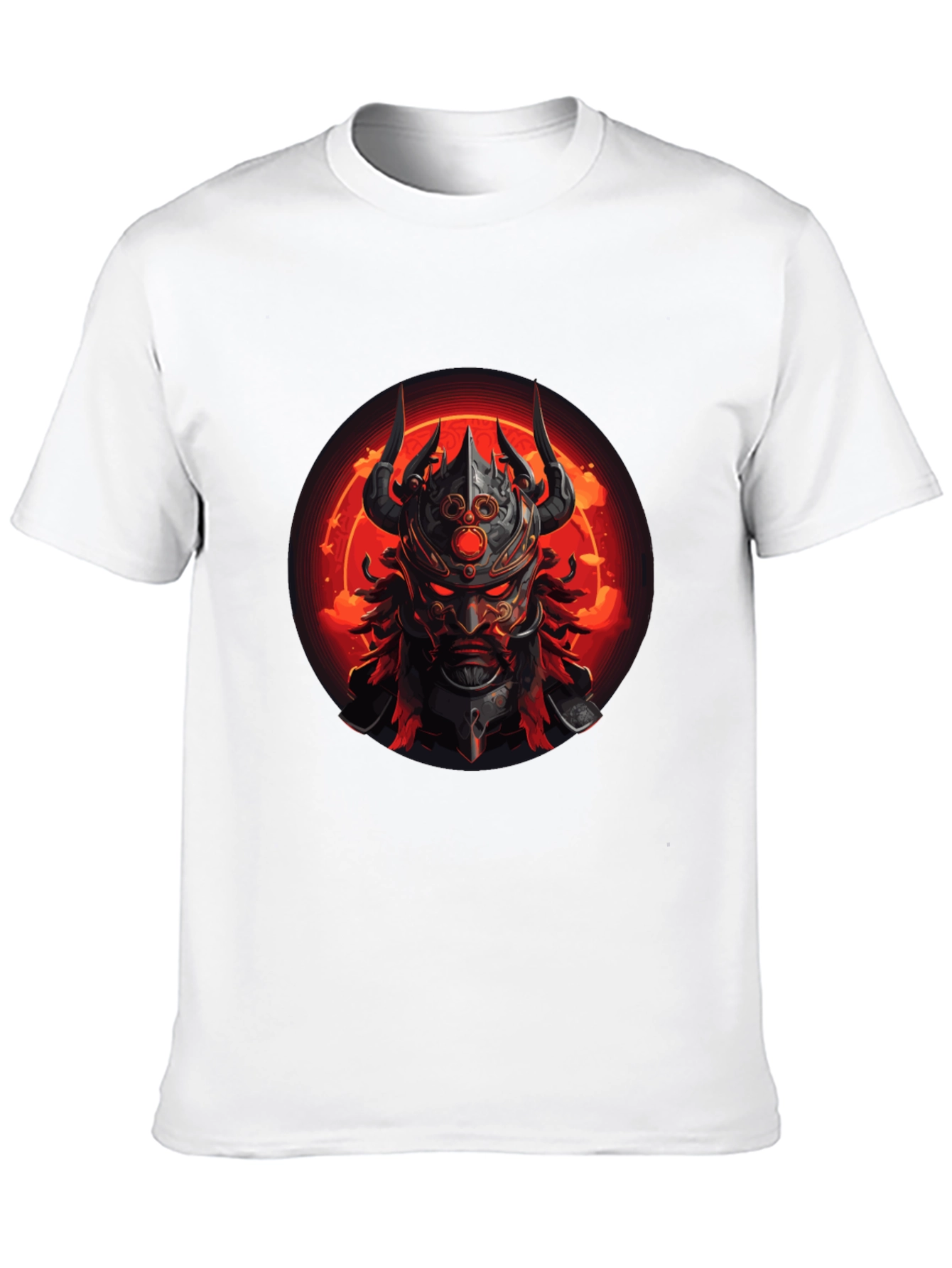 Unleash your inner warrior with this striking men's black t-shirt. The bold graphic features a fierce, horned warrior with glowing red eyes set against a fiery red background. This eye-catching design adds an edgy, powerful statement to your wardrobe. Crafted from a comfortable, soft fabric, this tee is perfect for everyday wear. Show off your unique style and make a statement wherever you go. Ideal for casual outings, concerts, or expressing your individuality. Experience comfort and style combined in this must-have t-shirt. Upgrade your look and command attention with this amazing piece!