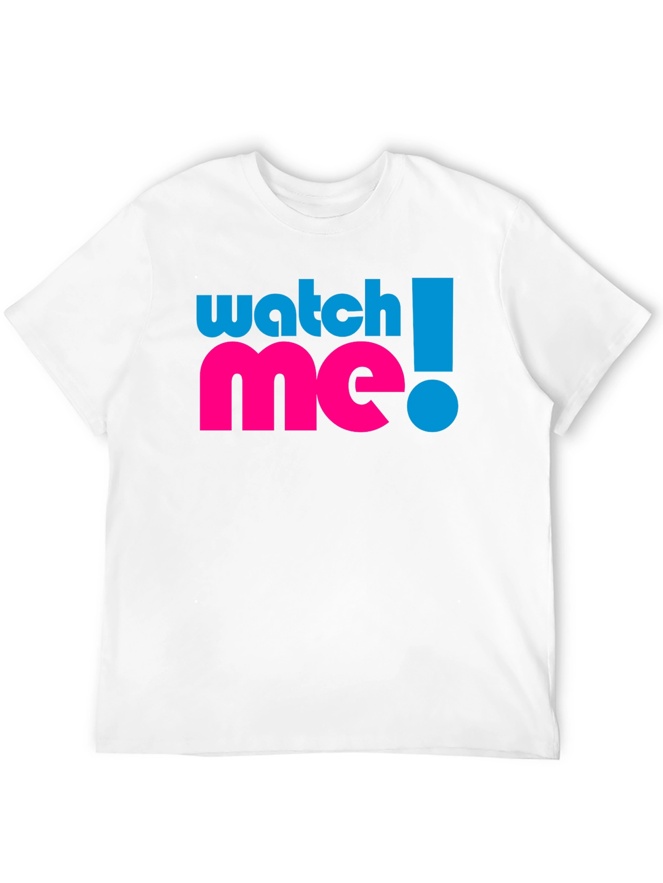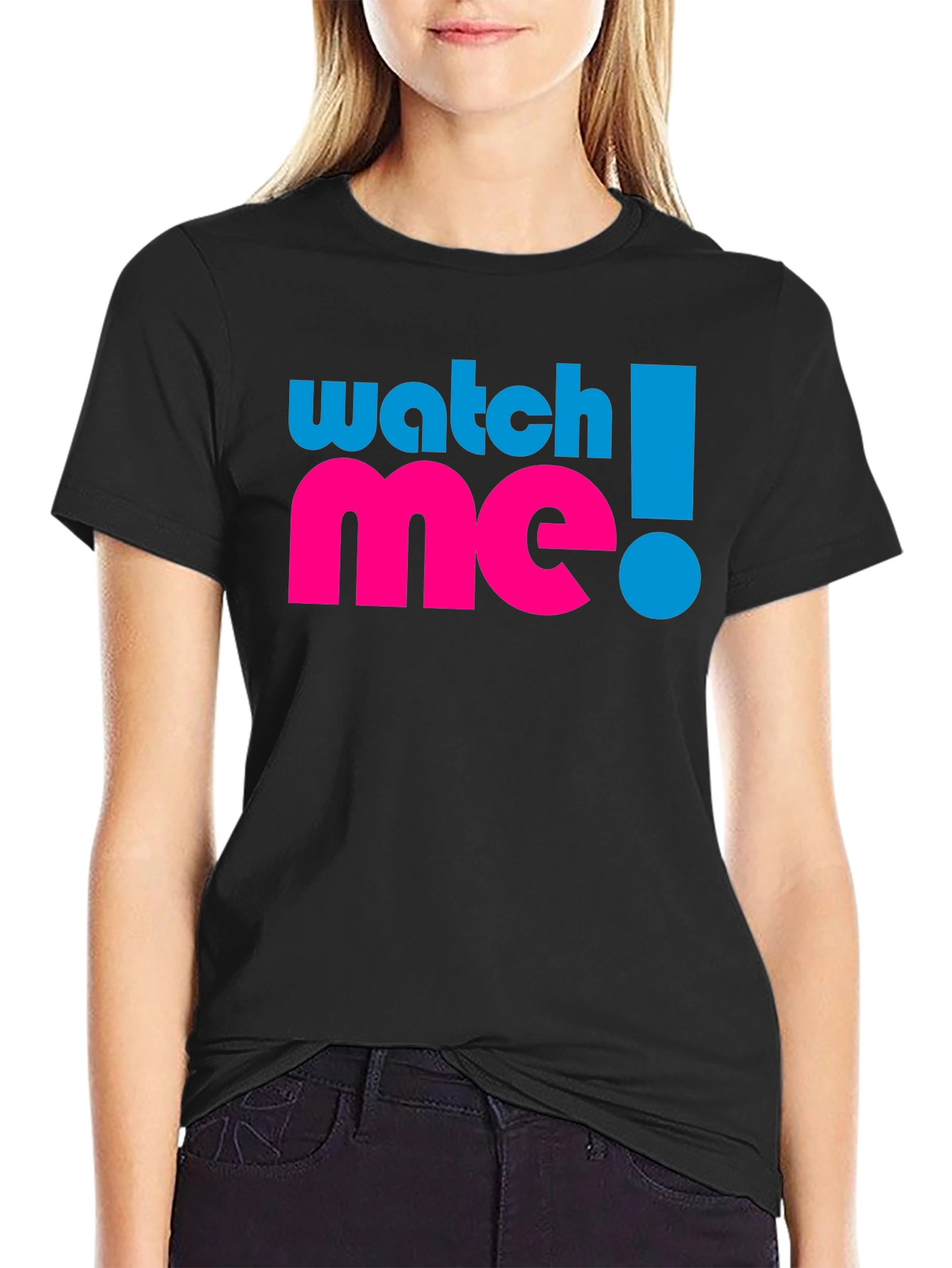 Make a statement with this eye-catching "Watch Me!" graphic tee. The shirt features bold, vibrant lettering in a playful combination of blue and pink. The text is clear and attention-grabbing. The shirt itself is a classic black tee, perfect for casual wear. Made from what appears to be a soft and breathable cotton blend, this tee ensures comfort. Whether you're hitting the streets, lounging at home, or looking to spark a conversation, this t-shirt is an ideal choice. Get ready to turn heads and let your personality shine!