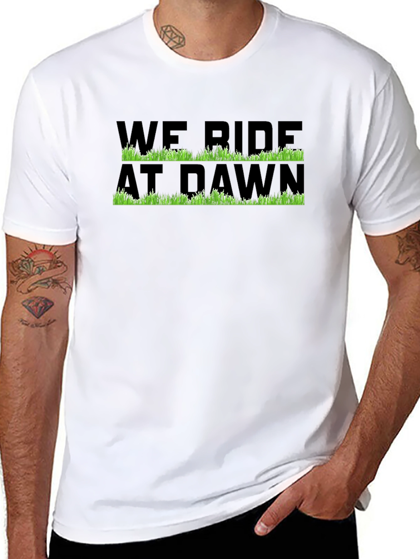 Show off your love for riding with this unique black graphic tee! The design features the bold statement 'We Ride At Dawn' with a creative grass-like effect, adding a touch of nature to your style. Made from comfortable fabric, this t-shirt is perfect for casual wear, outdoor adventures, or showcasing your passion for riding. Whether you're hitting the trails or hanging out with friends, this tee is sure to turn heads and spark conversations. Get yours today and let everyone know you're ready to ride at dawn!