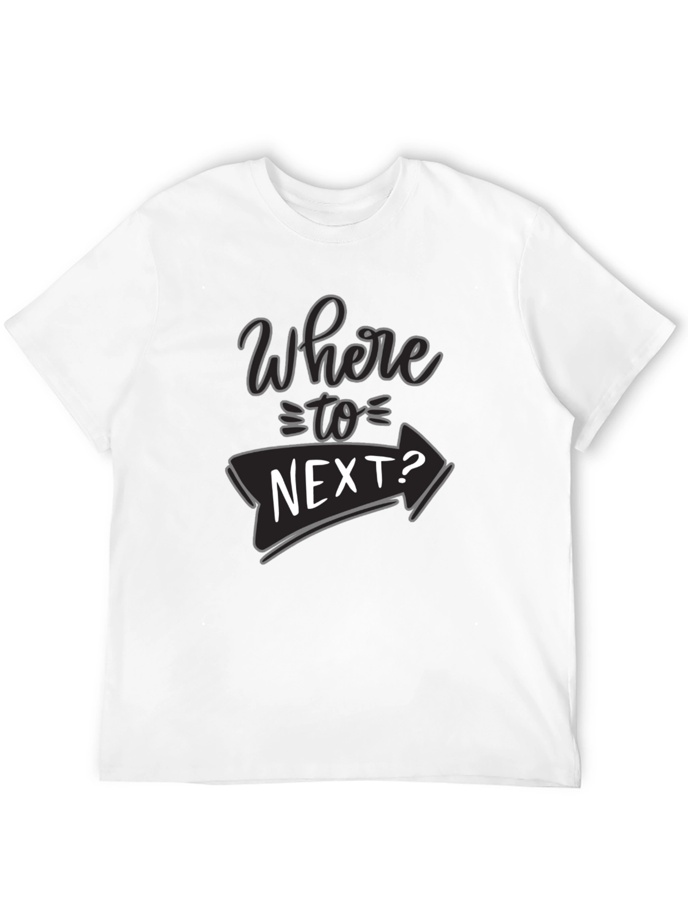 Embark on your next adventure in style with this sleek black t-shirt. Featuring a bold graphic design that asks "Where to Next?" inside a playful arrow, it's perfect for travel enthusiasts and wanderers. The shirt has a classic fit and short sleeves, crafted from what appears to be a soft, breathable fabric for all-day comfort. Its dark color makes it a versatile piece that can be dressed up or down. Whether you're planning your next journey or just love the adventurous vibe, this t-shirt is a stylish addition to any casual wardrobe. A must-have for anyone with a passion for exploration and new horizons!