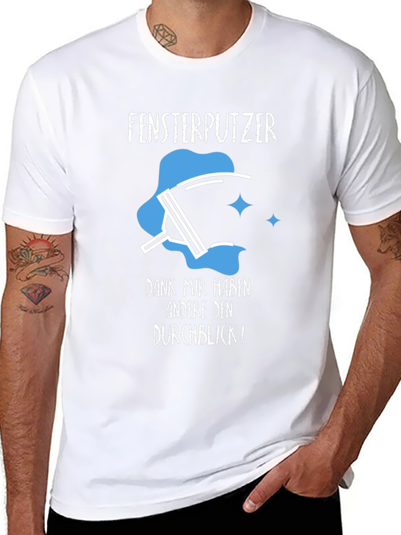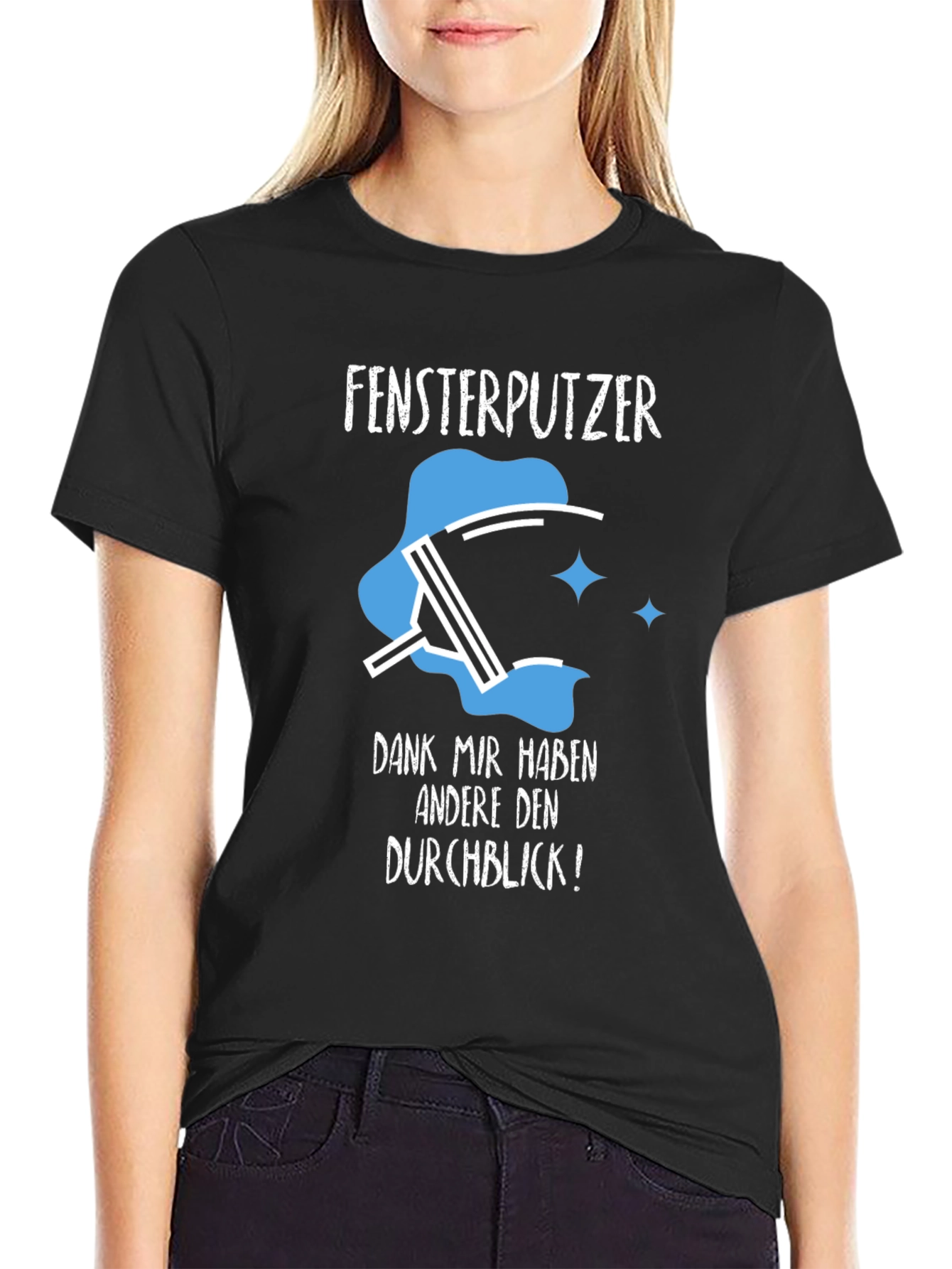 Show off your cleaning pride with this unique black t-shirt! Featuring the words "Fensterputzer" and "Dank mir haben andere den Durchblick!", it's perfect for any window washer. The graphic includes a stylized window cleaning tool and sparkling accents. Comfortable and eye-catching, this shirt is ideal for casual wear or as a fun work shirt. Makes a great gift for the hard-working window cleaner in your life! Get yours today and let everyone know you bring clarity to the world.