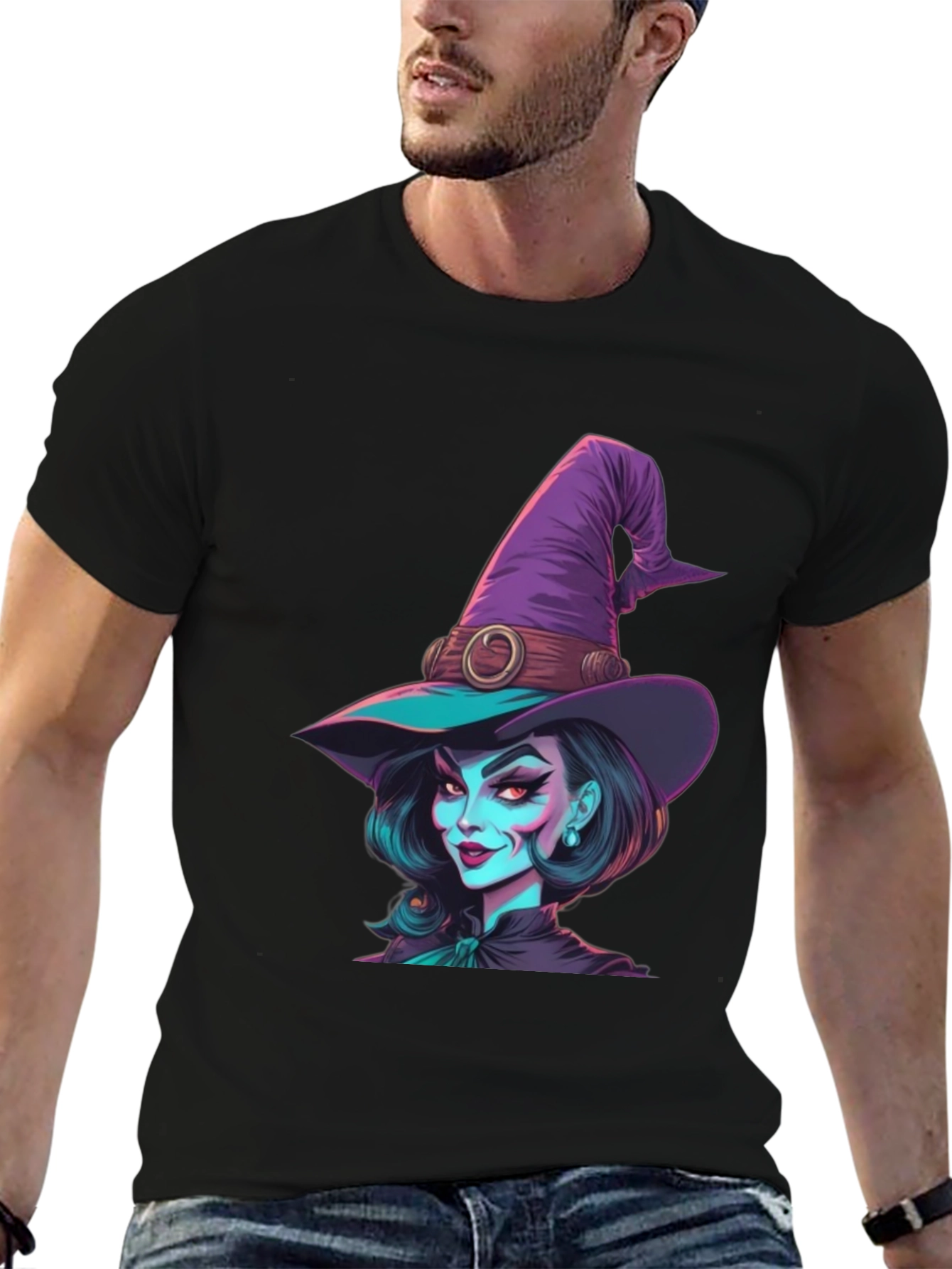 Embrace spooky season with this eye-catching graphic tee! Featuring a vibrant cartoon-style witch design, this black t-shirt is perfect for Halloween or any day you want to add a touch of magic to your style. The detailed print showcases a sassy witch with a purple hat and striking makeup. Made from a comfortable, breathable fabric, this tee is ideal for casual wear, costume parties, or as a unique gift for witchy friends. Get ready to turn heads and spread some Halloween cheer with this fun and fashionable t-shirt!