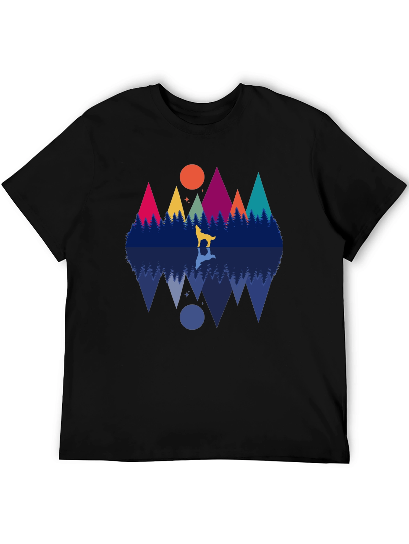 Show off your unique style with this eye-catching graphic tee! This black t-shirt features a vibrant design with colorful mountains, trees, and a wolf silhouette reflecting on a still lake. The design creates a tranquil, nature-inspired aesthetic with a touch of modern art. Made from comfortable, breathable fabric, this tee is perfect for everyday wear, outdoor adventures, or casual outings. Make a statement and express your love for wildlife and stunning landscapes with this distinctive t-shirt. Ideal for those who appreciate art, nature, and comfortable fashion.