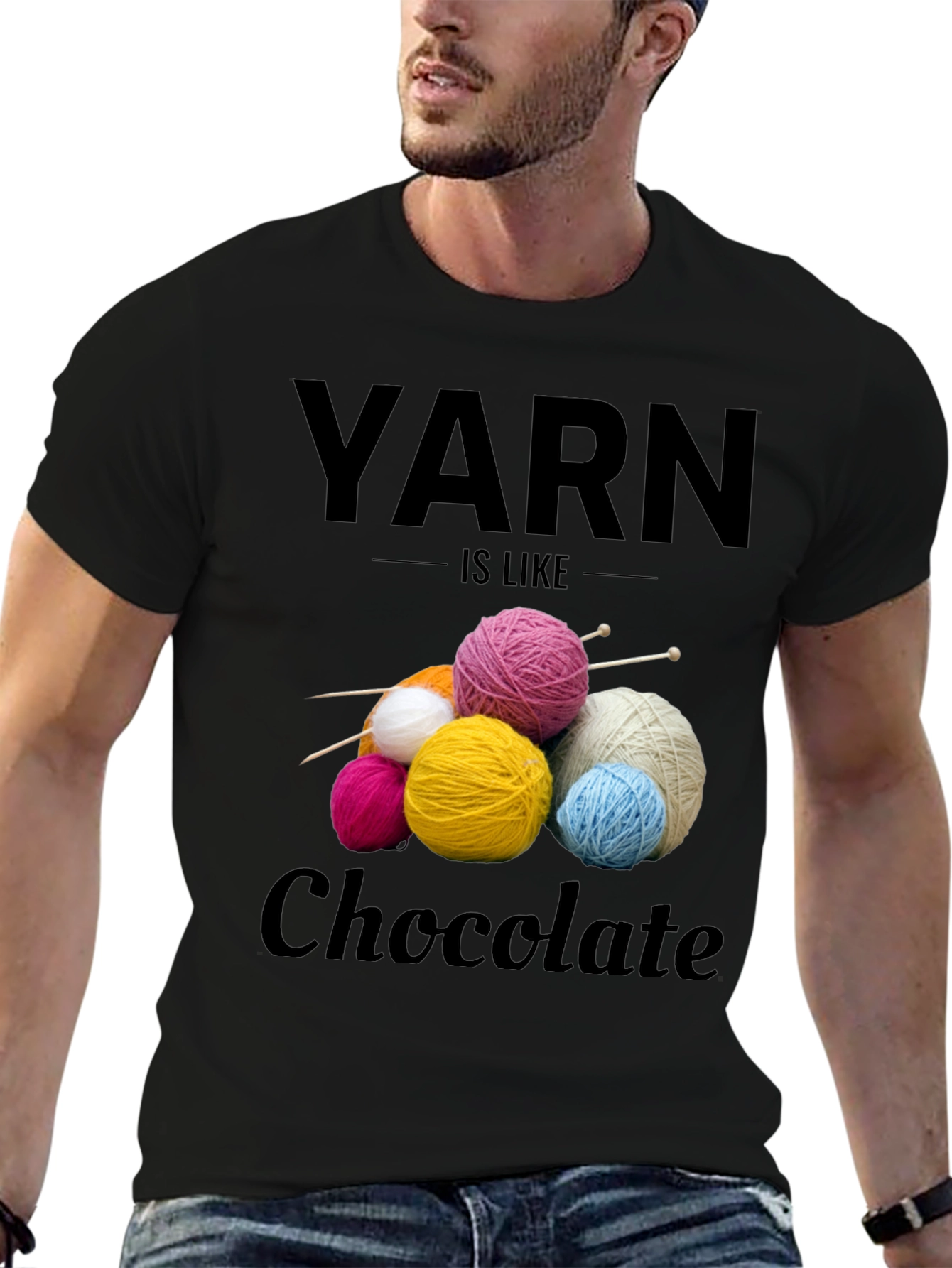 This classic fit black tee features a playful graphic for yarn enthusiasts. A variety of colorful yarn balls and knitting needles adorn the front, accompanied by the statement "Yarn is like Chocolate" in contrasting text. The design suggests a love for knitting and crafting, appealing to those who find comfort and joy in working with yarn. Made from a comfortable, breathable material, this t-shirt is ideal for casual wear, craft meetups, or as a gift for the avid knitter in your life. Show off your passion for yarn with this unique and stylish tee!