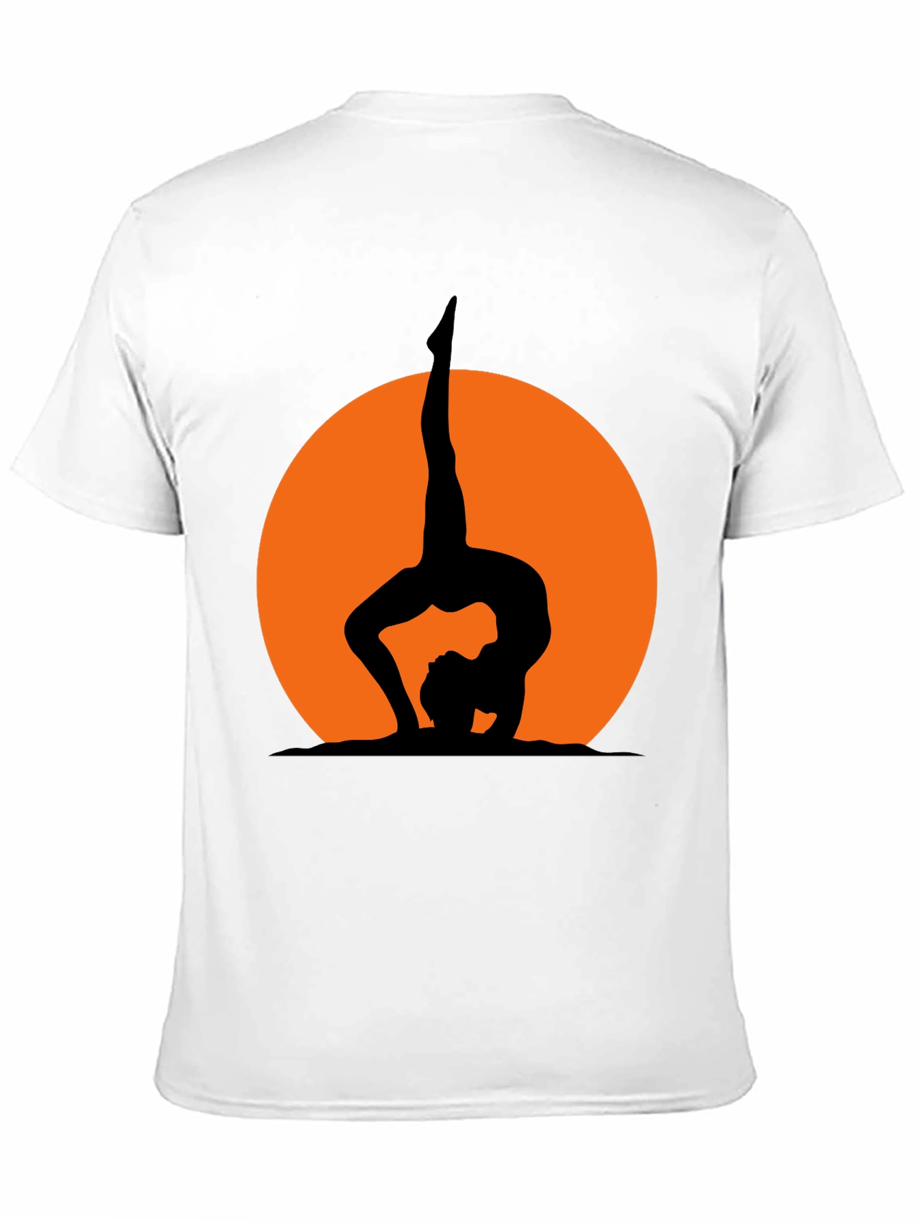 Elevate your everyday style with this striking black t-shirt featuring a captivating yoga silhouette design. The tee showcases a detailed graphic of a figure in a challenging yoga pose set against an orange sun backdrop. Made from a comfortable, breathable fabric, this shirt is perfect for workouts, casual outings, or simply lounging at home. The classic crew neck and short sleeves offer a relaxed fit that suits any body type. Whether you're a yoga enthusiast or appreciate unique designs, this tee is sure to become a wardrobe staple. Pair it with your favorite jeans or leggings for a stylish and comfortable look.
